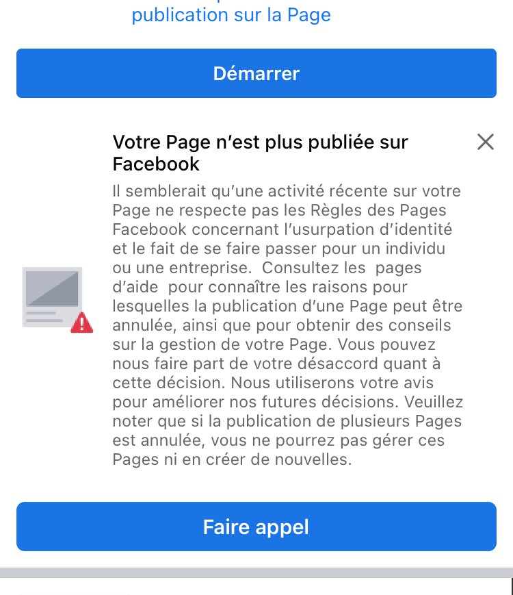 (…) une activité récente sur votre Page ne respecte pas les règles des pages FaceBook concernant l’usurpation d’identité (…). Consultez les pages d’aide pour connaître les raisons pour lesquelles la publication d’une page peut être annulée (…).  Vous pouvez nous faire part de votre désaccord quand à cette décision. Nous utiliserons votre avis pour améliorer nos fugtures décisions (…).