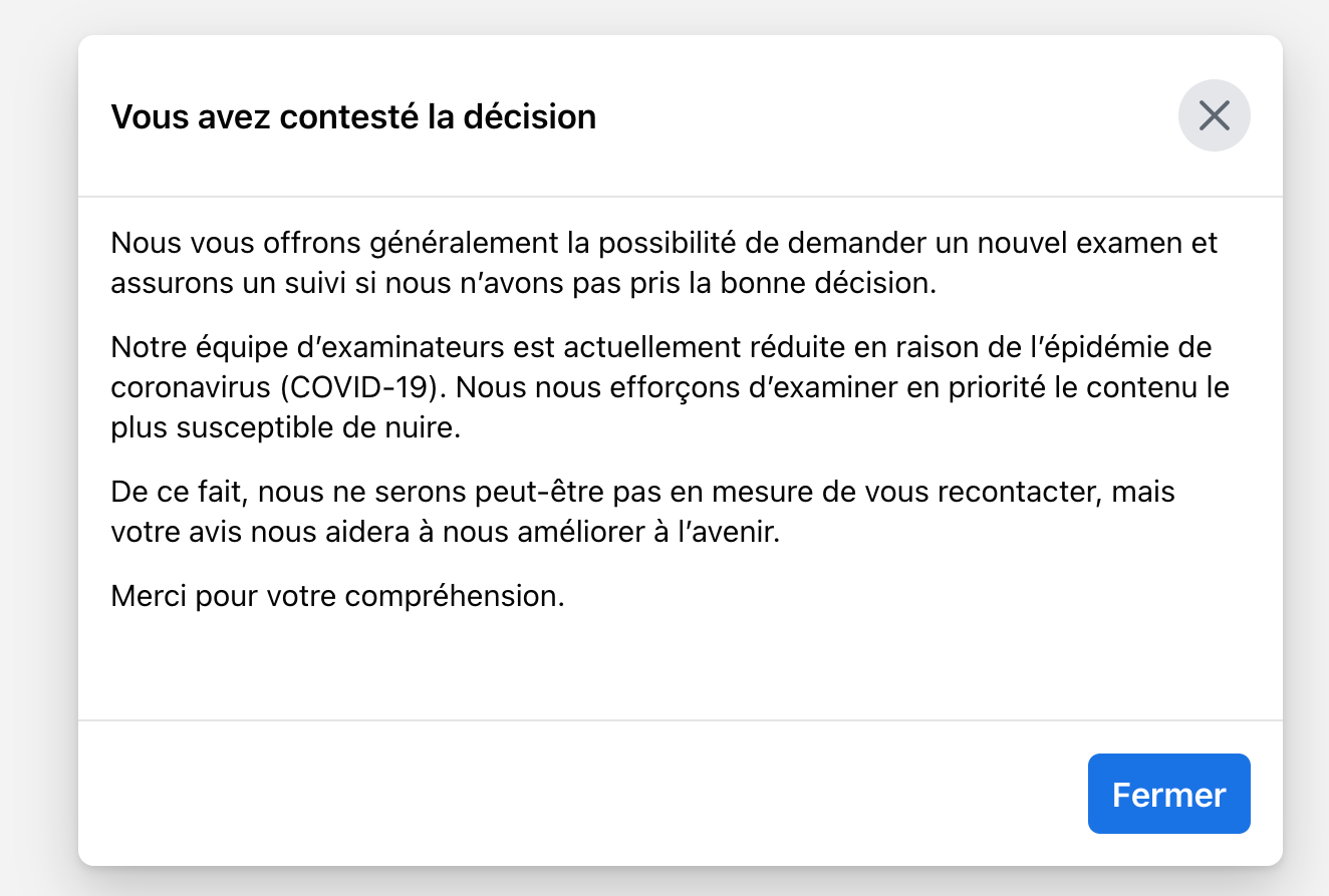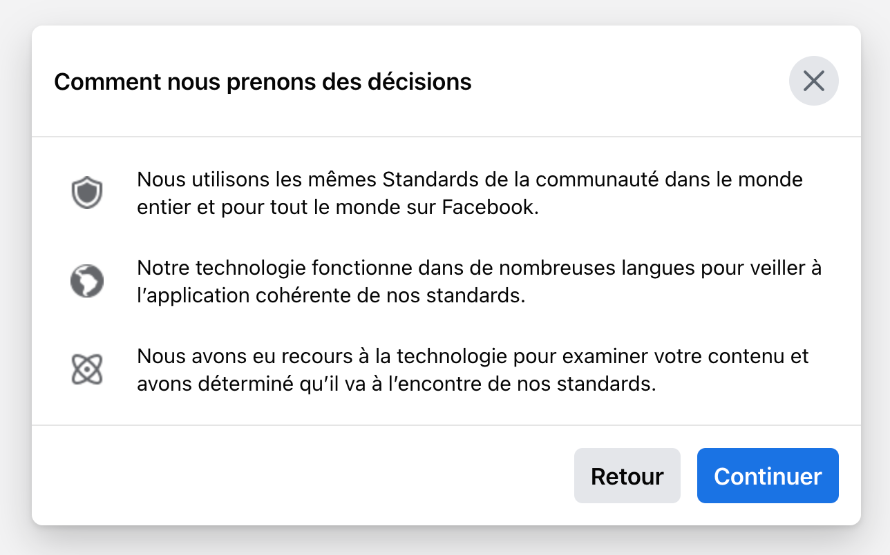 Comment nous prenons des décisions: (…) Nous avons eu recours à la technologie pour examiner votre contenu et avons déterminé qu’il va à l’encontre de nos standards.