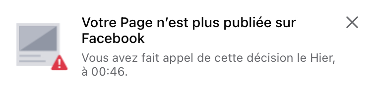 Quand la page a été “dépubliée” en juin 2022, FaceBook nous a informé avec le message ci-dessous.