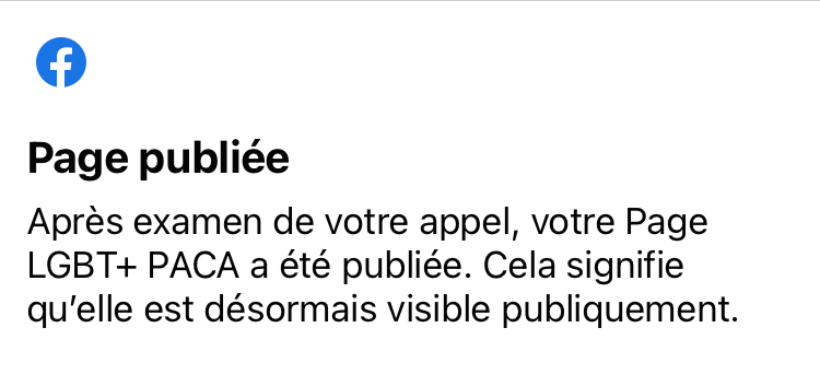 En 2022, FaceBook a supprimé la page LGBT PACA qui relayait les informations des associations de la région depuis 2011. Selon les maigres informations reçues, cette décision a été prise par “la technologie”. Aucun appel n’était possible. Nous regrettons que cette “technologie” nous ait mis dans l’incapacité de continuer à communiquer sur ce réseau des actions des associations qui auraient été utiles à la communauté LGBT. En octobre 2022, la page est publiée à nouveau après l’intervention personnelle d’un·e employé·e de meta.